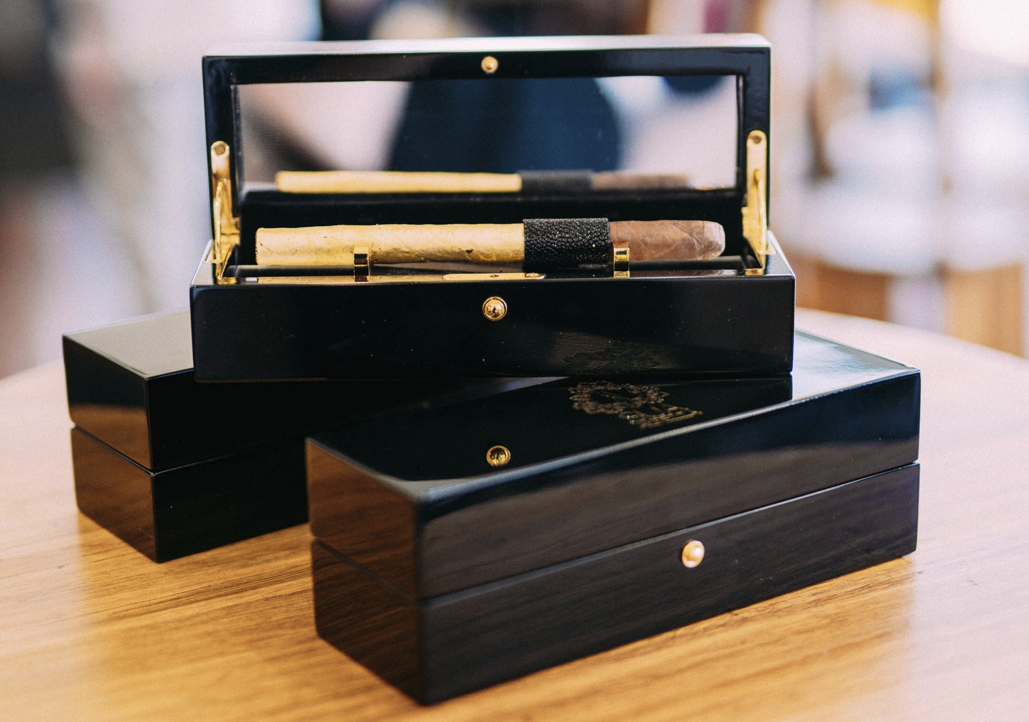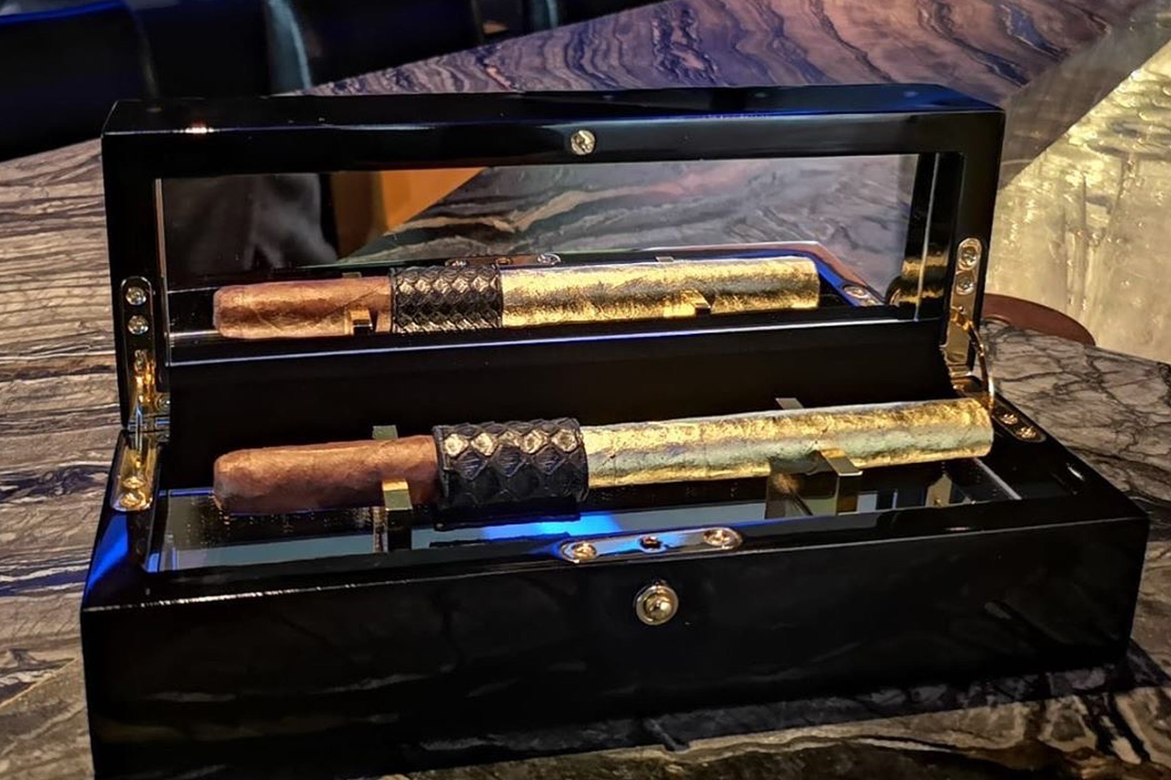 Wrapped in the purest 24kt Gold Leaf, adorned with an exotic leather ring, and displayed in a gloss black chest with mirrored interior ~ Luxury redefined.